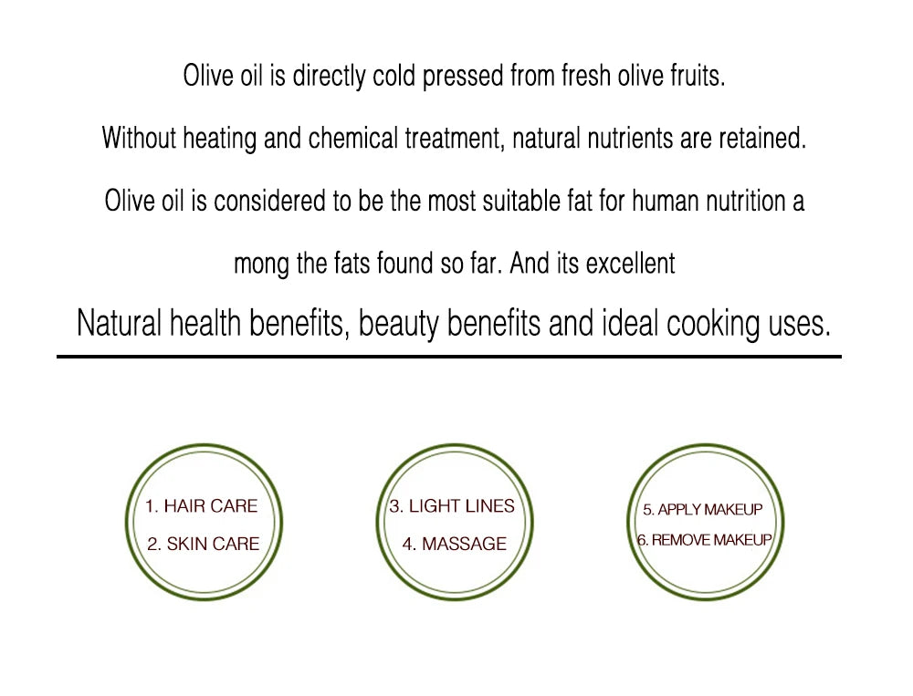 SKINCARE MOISTURIZER: Whether applied to face or body olive oil will penetrate deep into the skin and provide a long-lasting shield of moisture to keep skin smooth and supple. Used either as a night cream or daily moisturizer it is best applied to damp skin when water can help reduce any feeling of greasiness. Recommended for normal/combination skin dry/damaged skin and mature/aging skin. Olive oil is one of the best natural foot care treatments solutions for dry, cracked feet.