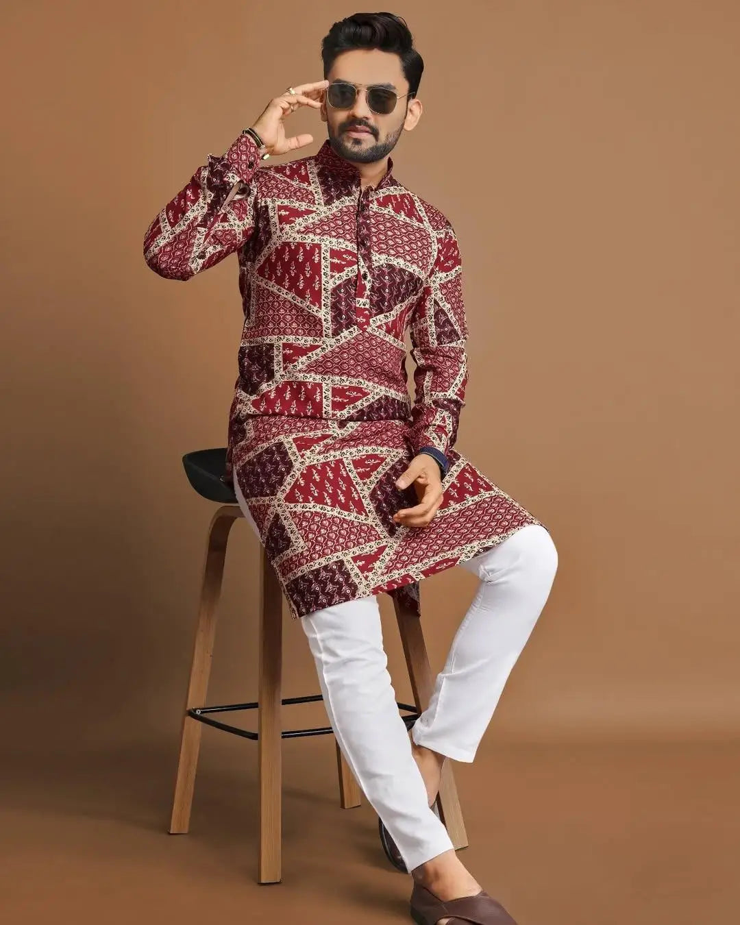 2025 Men Digital Printed Kurta Vardha Regular Fit Mandarin Collar Long Suitable All Occasions Such Wedding Hari Raya Aidilfitri
