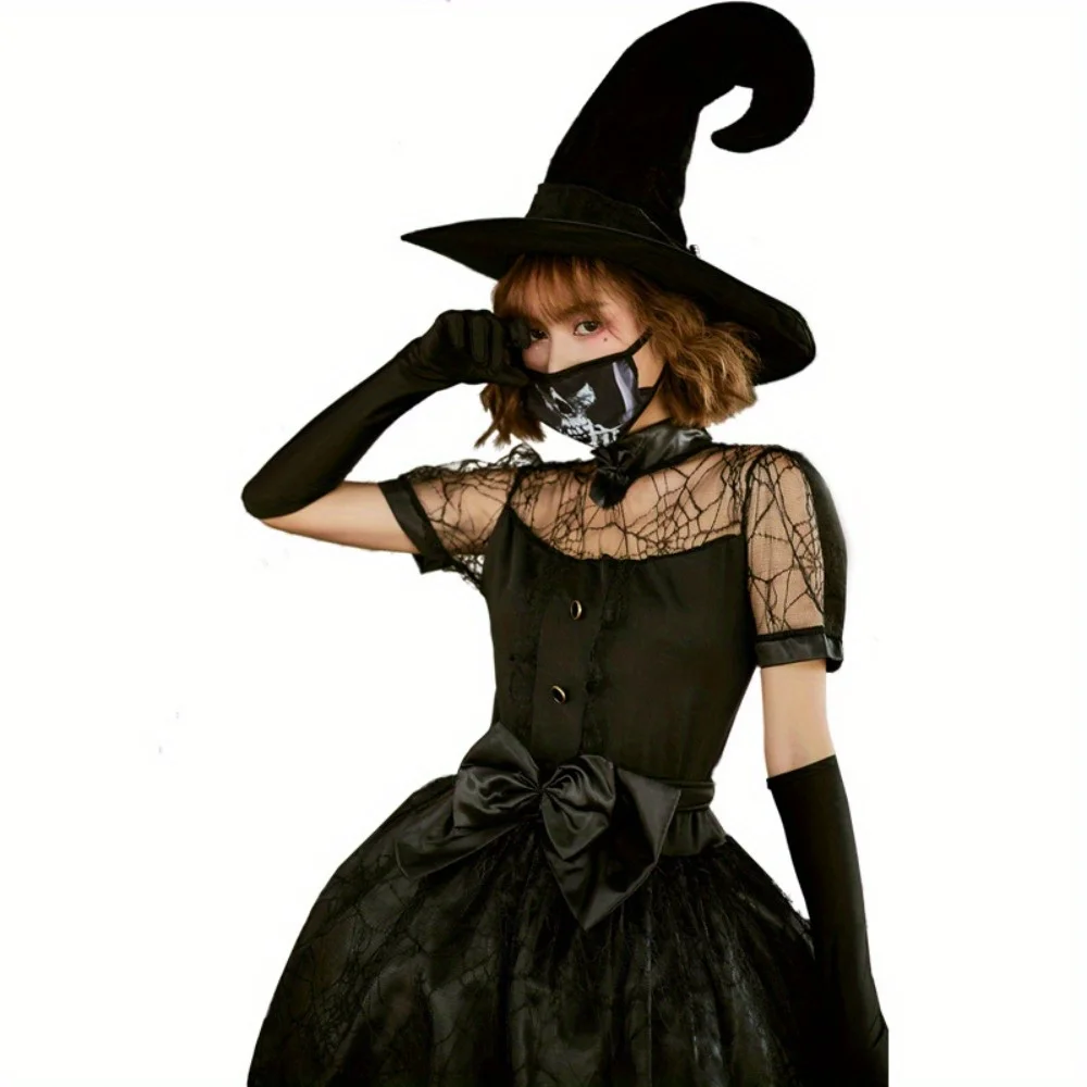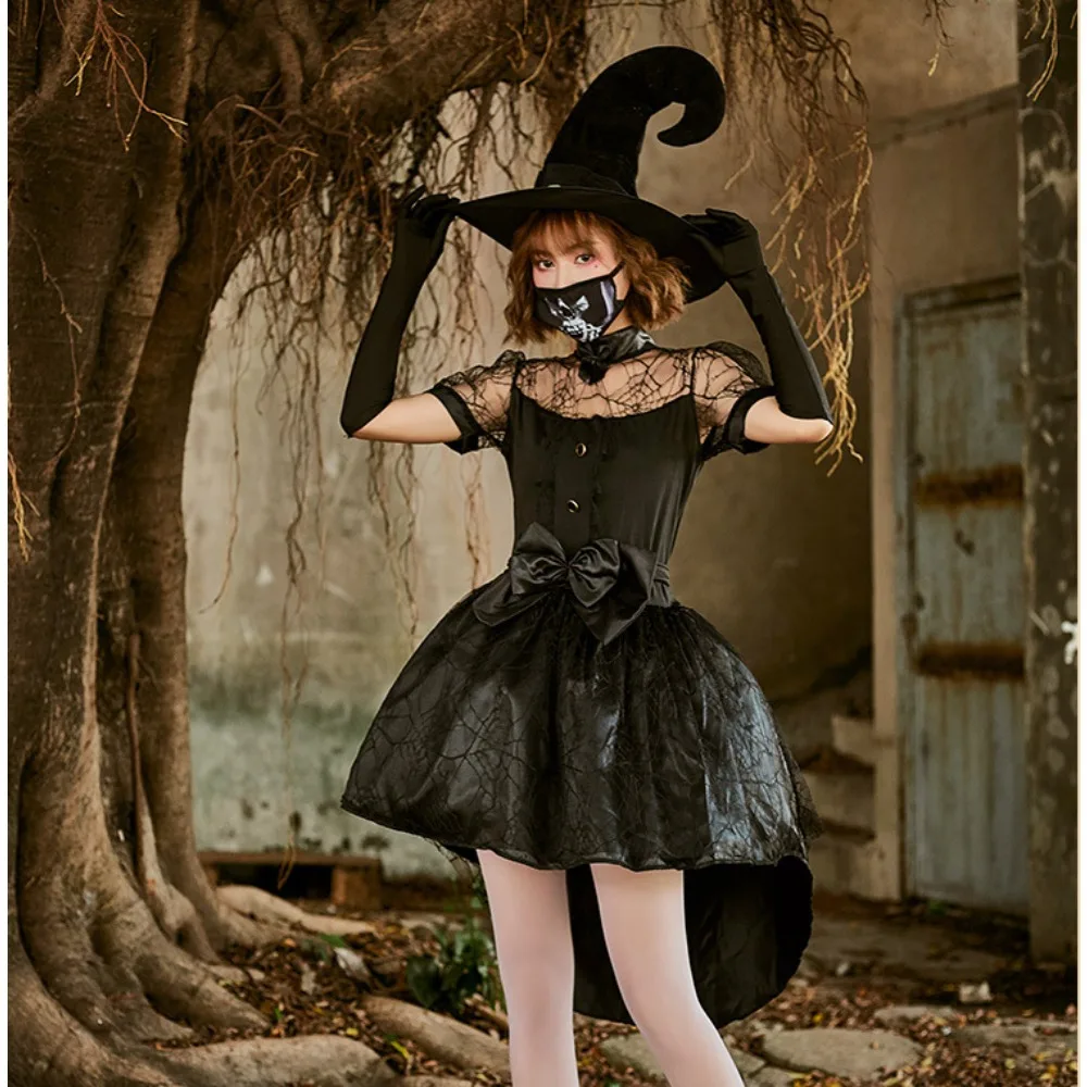Halloween Black Mesh Hollow Witch Tailcoat Costume: Gothic Sorceress Cosplay Outfit for Party Performances