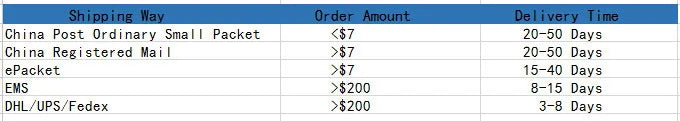 1.we ship all of our items to worldwide within48hoursby china post registered mail/ePacket/china post ordinary small packet/DHL/EMS.
