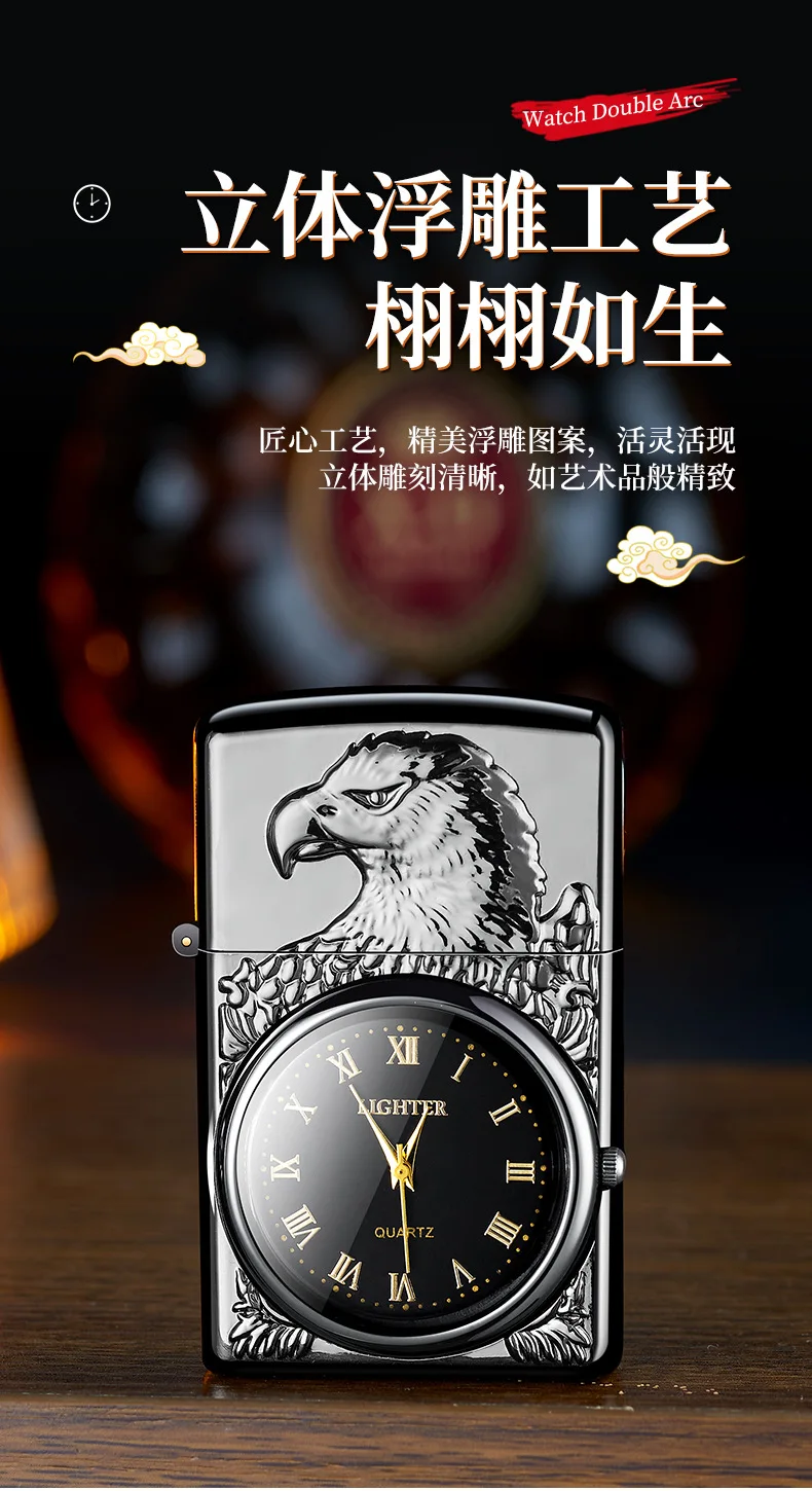 Metal Windproof Lighter Embossed Electronic Watch Dual Arc Rechargeable Lighter Pulse Cigarette Lighter Gift Smoking Accessories