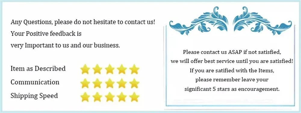3.When you receive the item and satisfied with the product, please leave positive feedback and 5 scores reviews. We will leave a 5 Scores reviews feedback for you.If, for any reason you are not satisfied with your purchase, please contact via aliexpress and we will do our best to resolve it. Please don't leave neutral or negative feedback without any communition with.Thank you!
