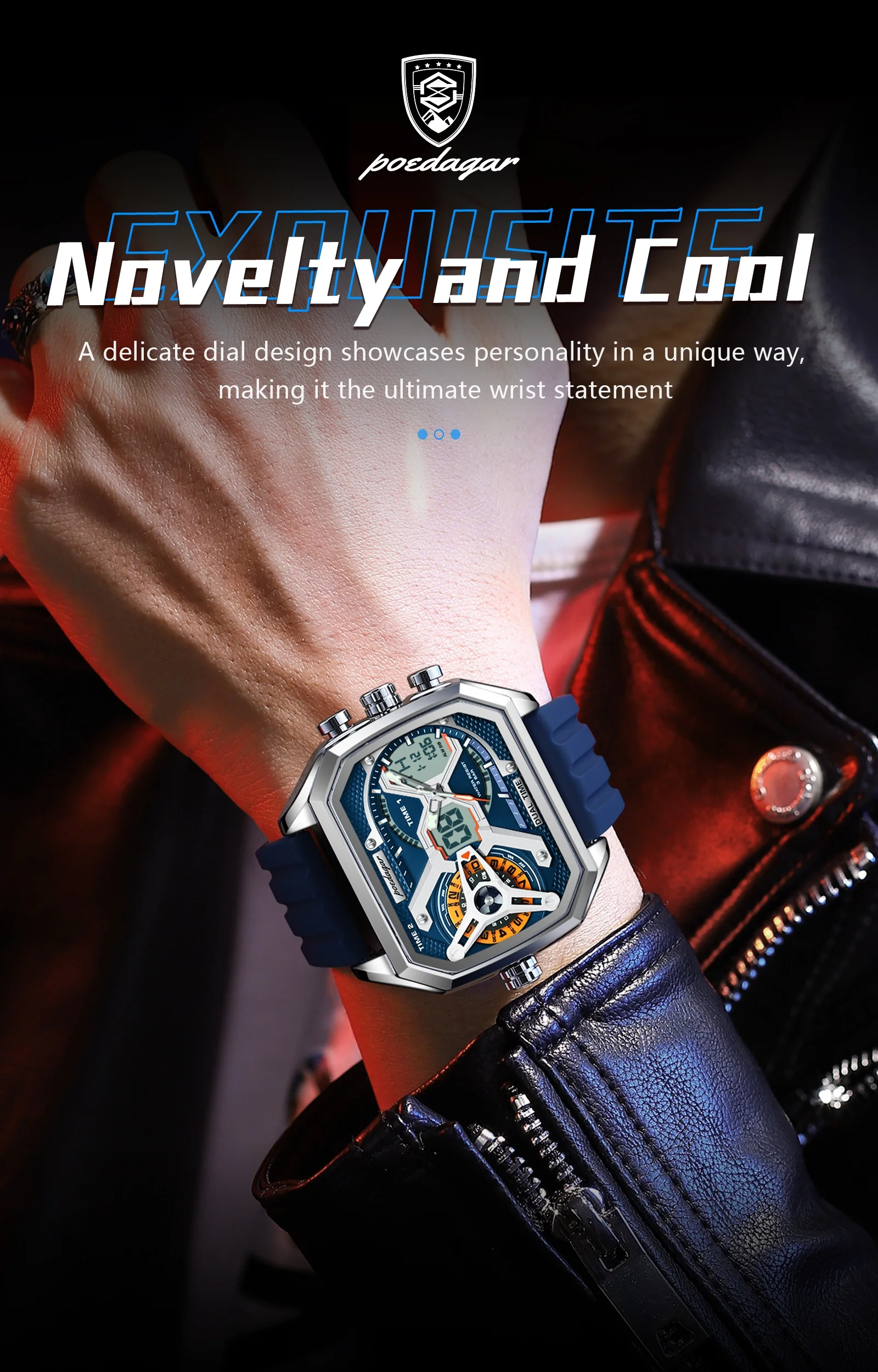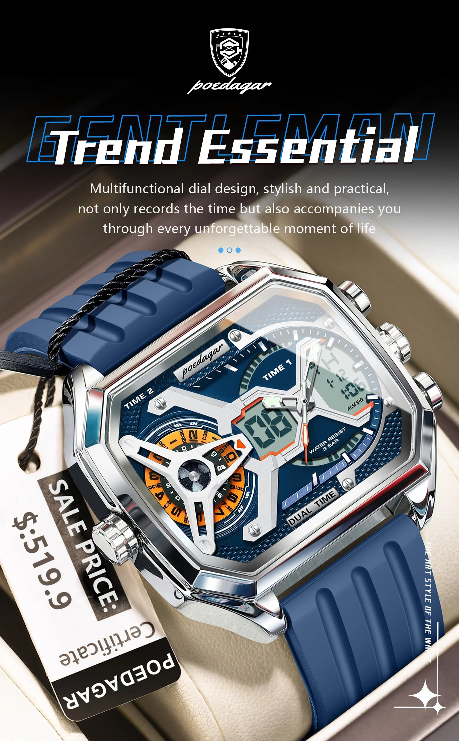POEDAGAR Top Luxury Men Clock Date Week Luminous LED Man Watch Silicone Strap Electronic Dual Time Fashion Men's Quartz Watches