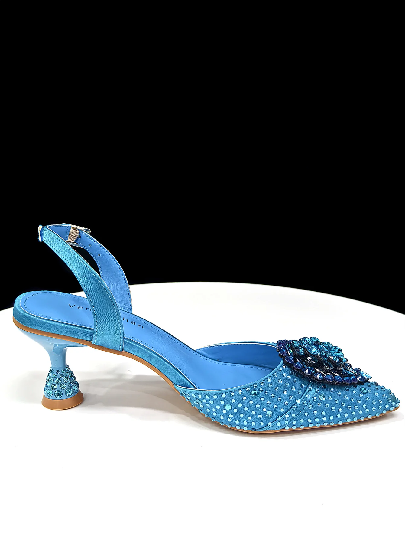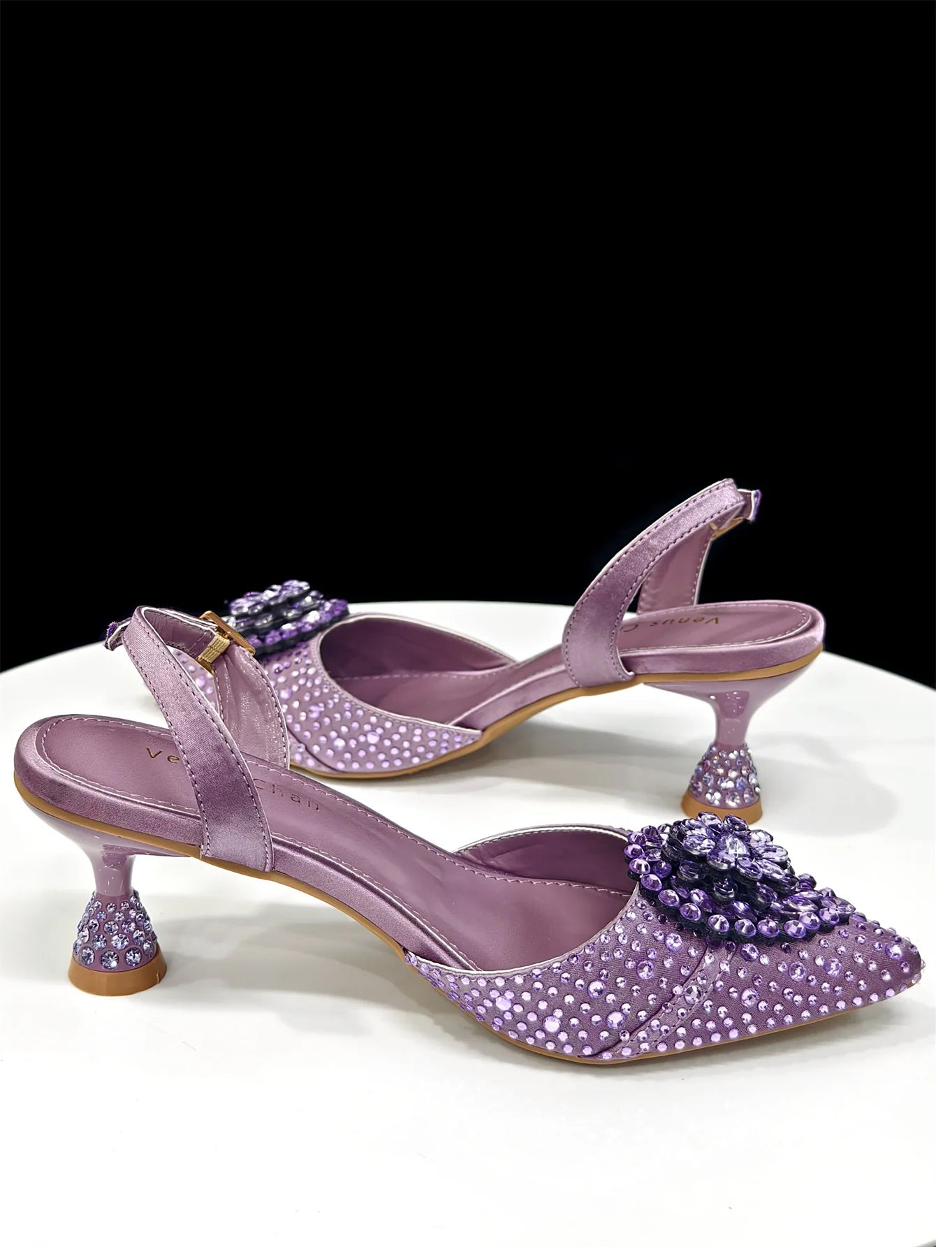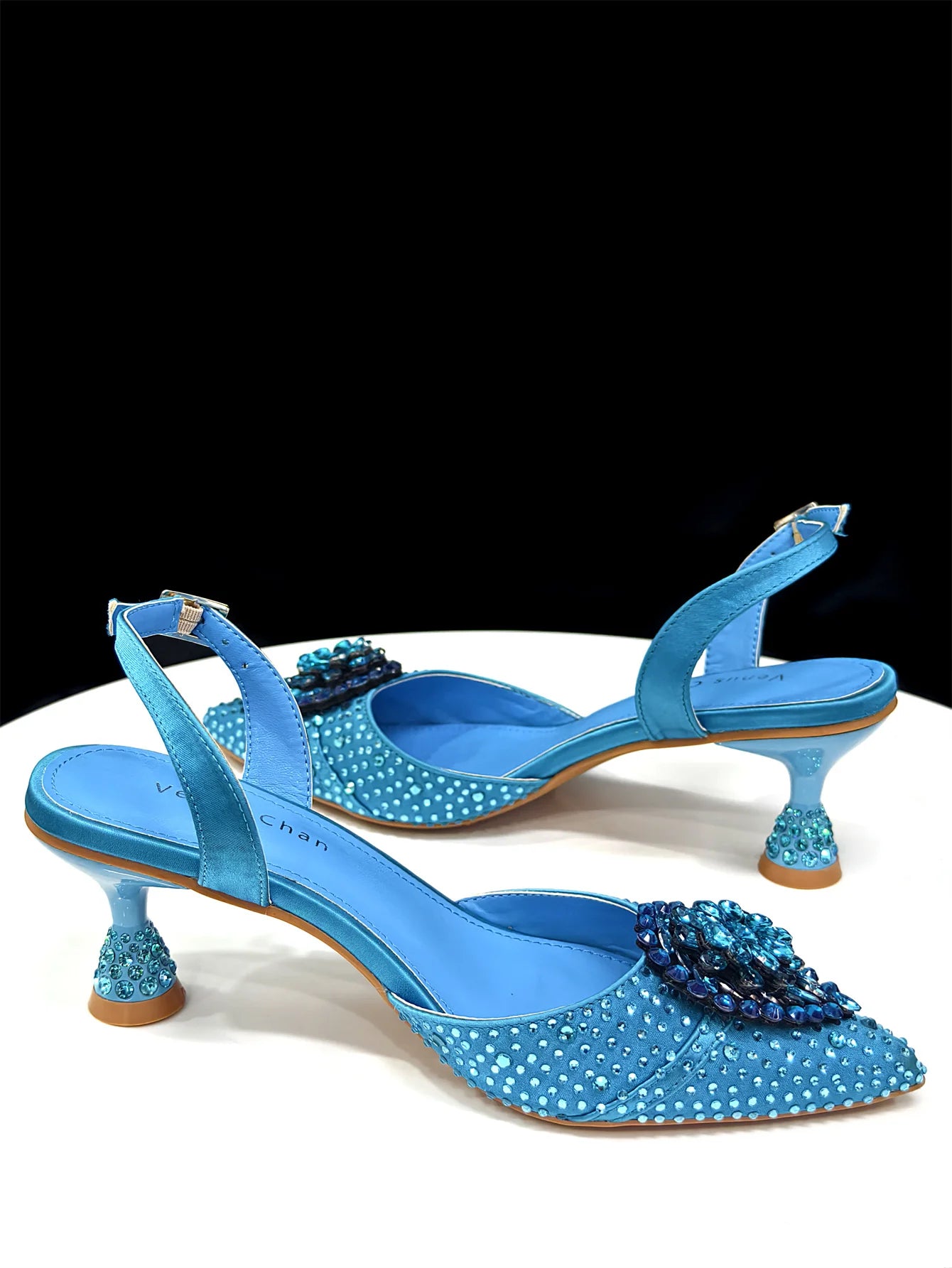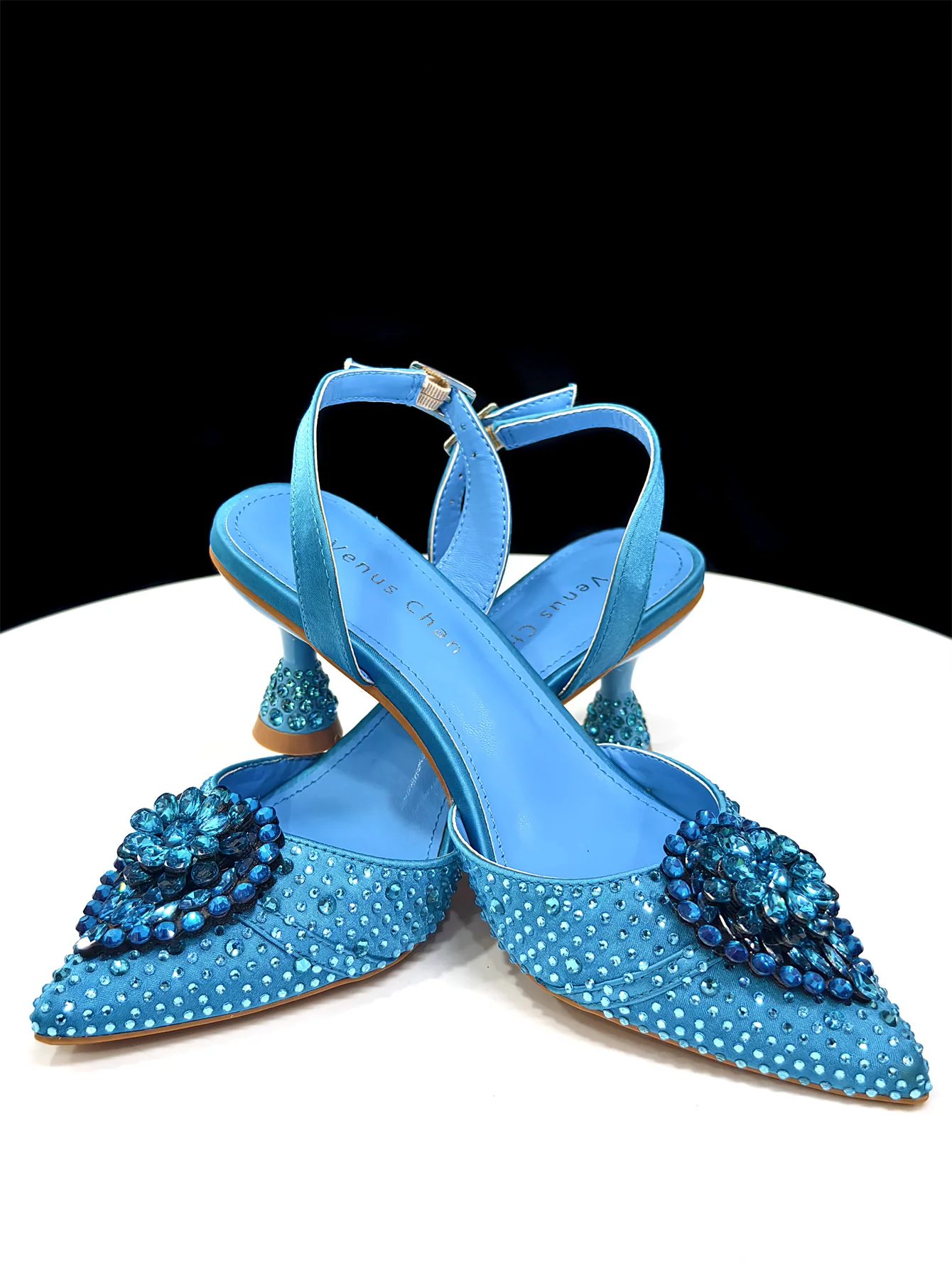 Pointed Toe High Heels Sandals for Women 2025 Elegant Blue Diamond Pumps Italian Shoes and Bags Matching Set