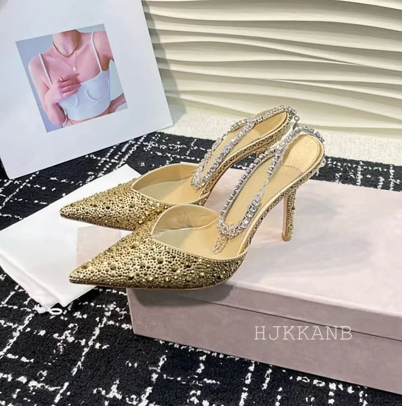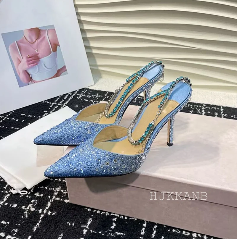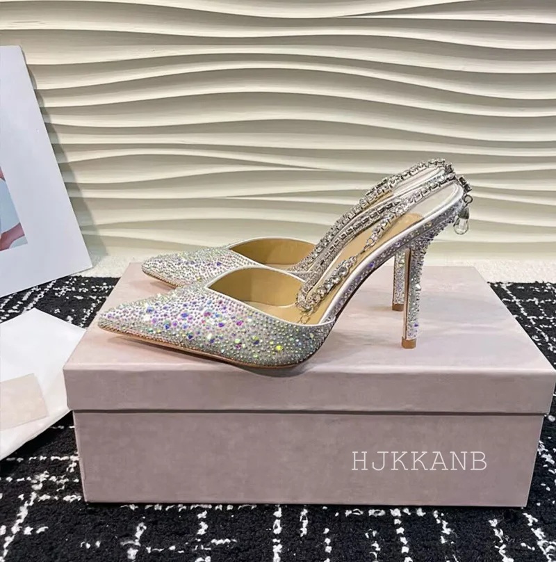 Pointed Toe Thin High Heel Pumps Women Ankle Strap Crystal Single Shoes Bling Rhinestone Sandals Sexy Spring Party Dress Shoes