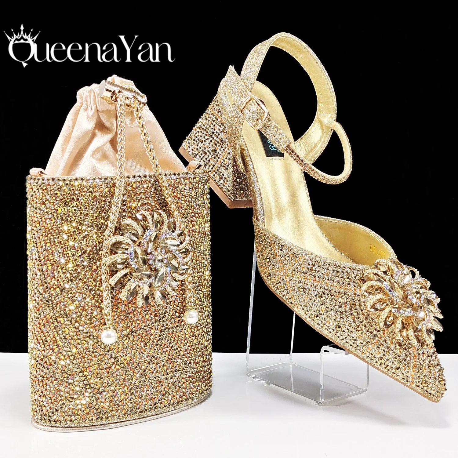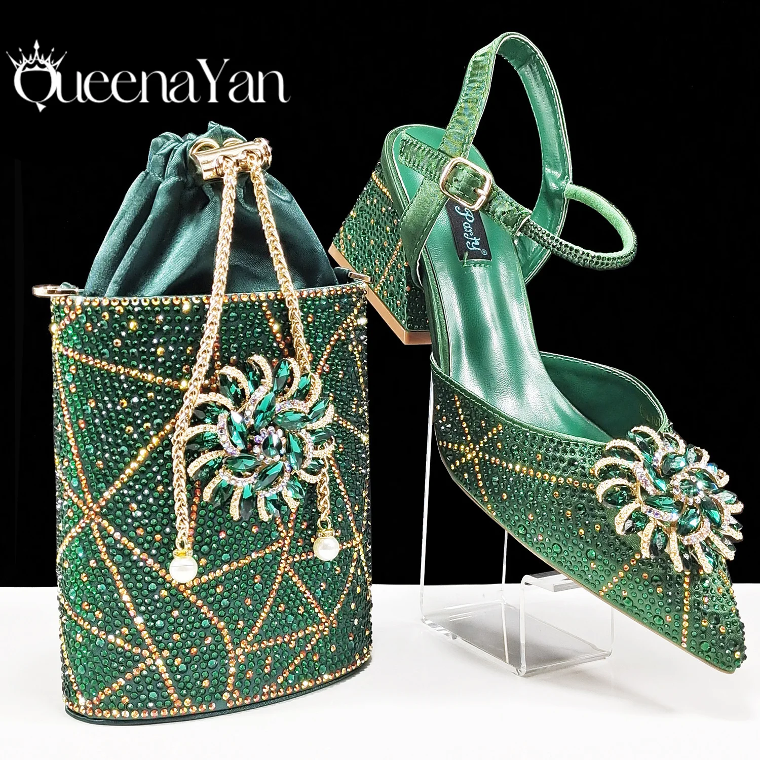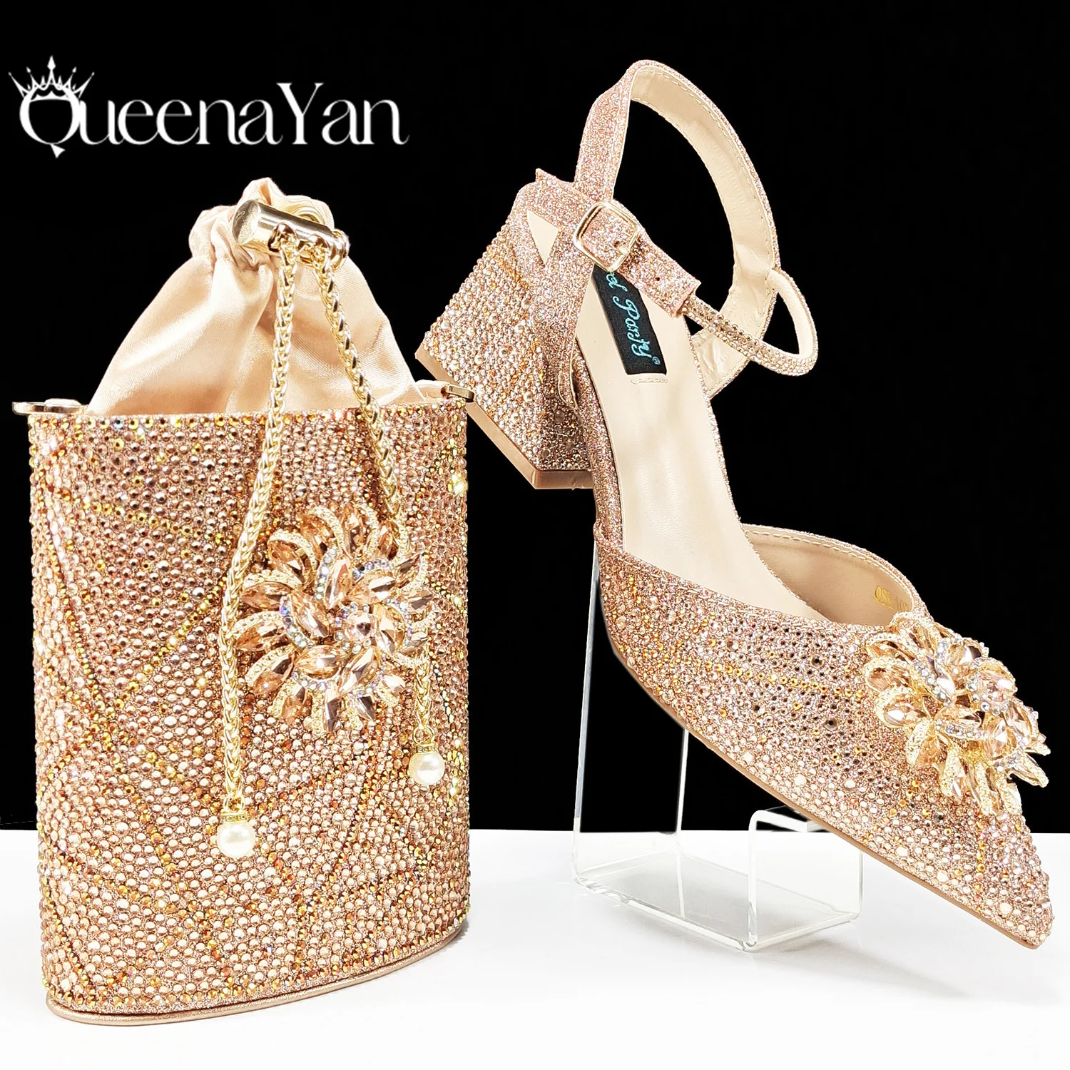 QueenaYan African Ladies Elegant Pointed Toe Shoes with shiny Metal Stand Bag Women Party Shoes or Commuting Shoes and Bag Set