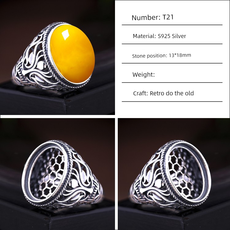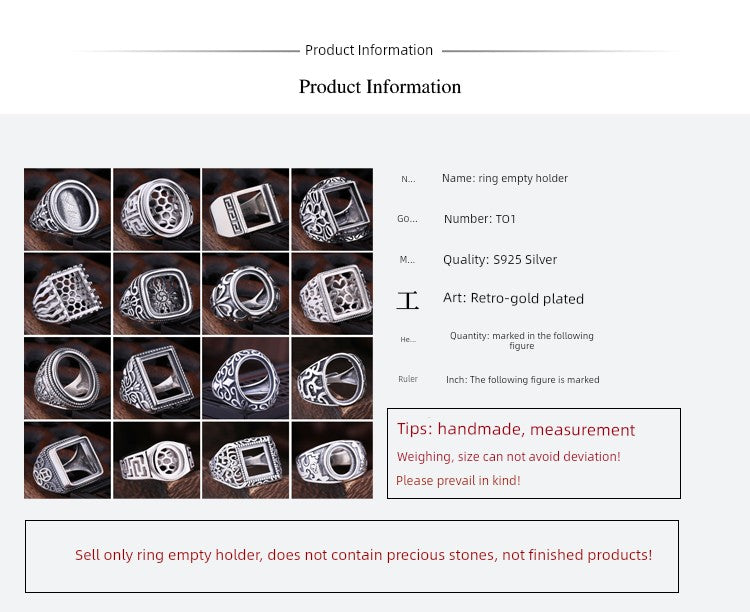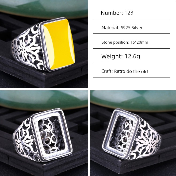 S925 Sterling Silver Ring Frame DIY Inlaid Beeswax Turquoise Amber South Red Ring Gem Opening Men Square Ring Setting