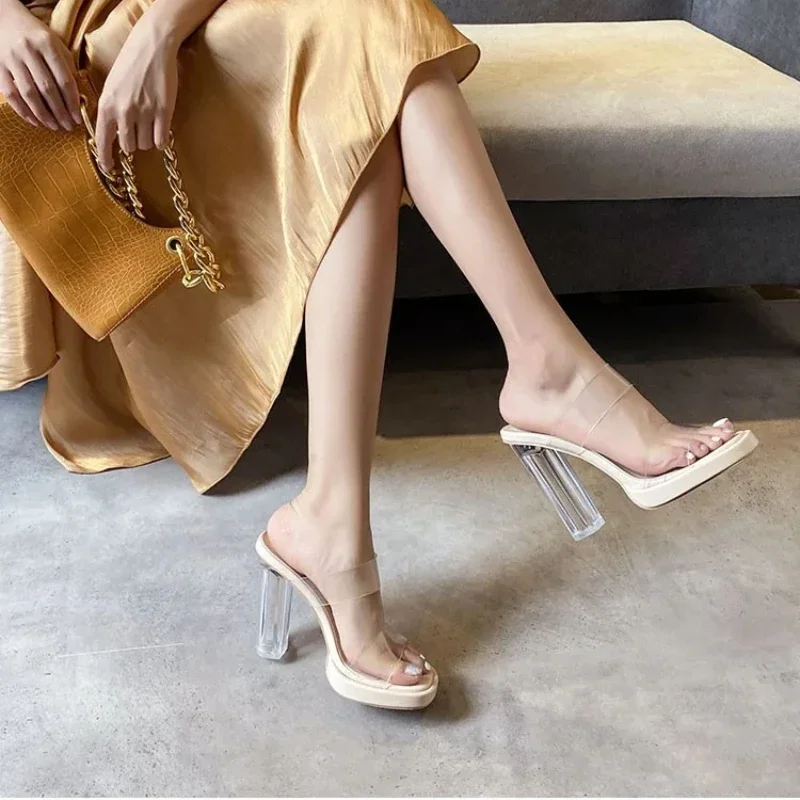 Women's High Heels 2025 Summer New Table Line Not Tired Feet Thick Crystal Slippers Women's Shoes